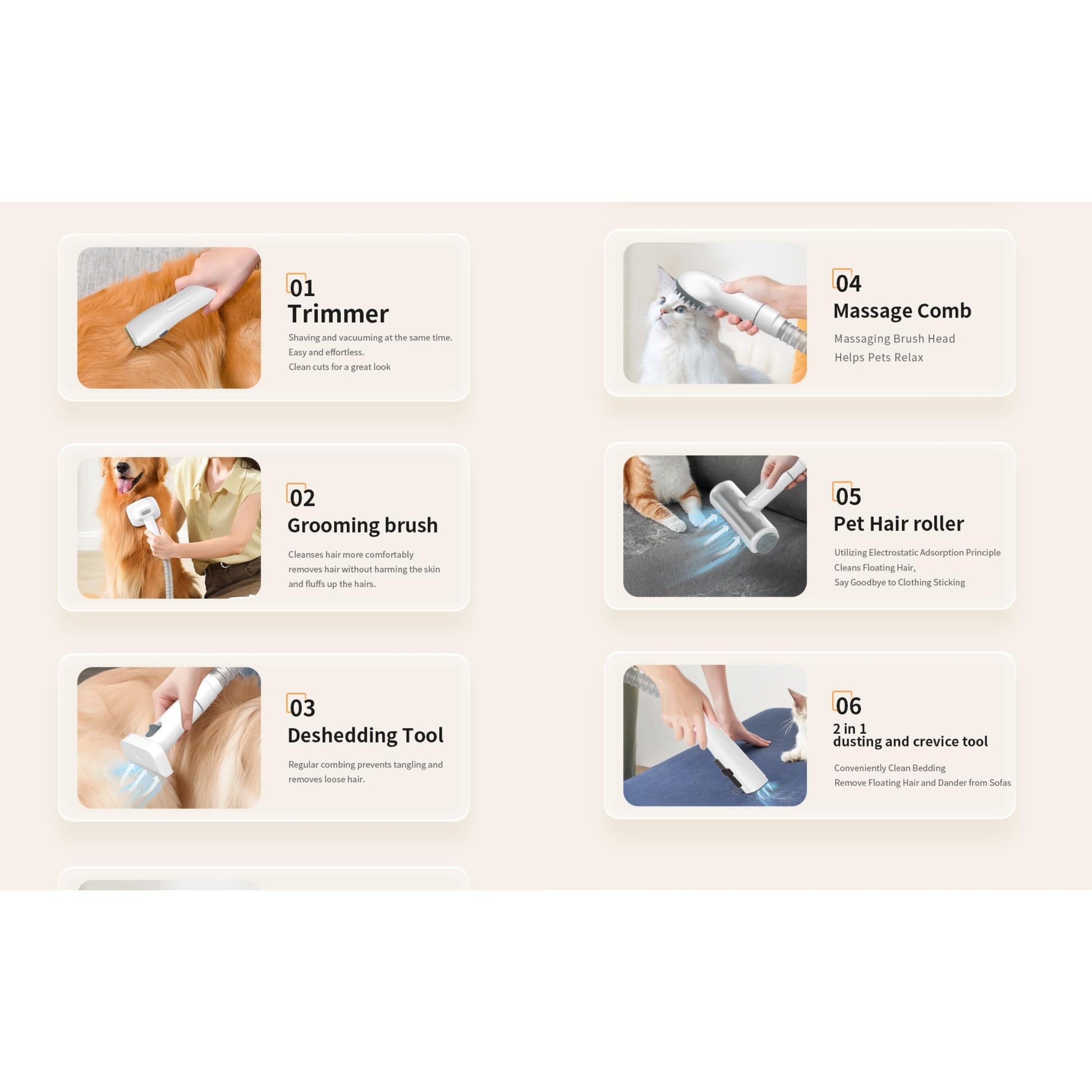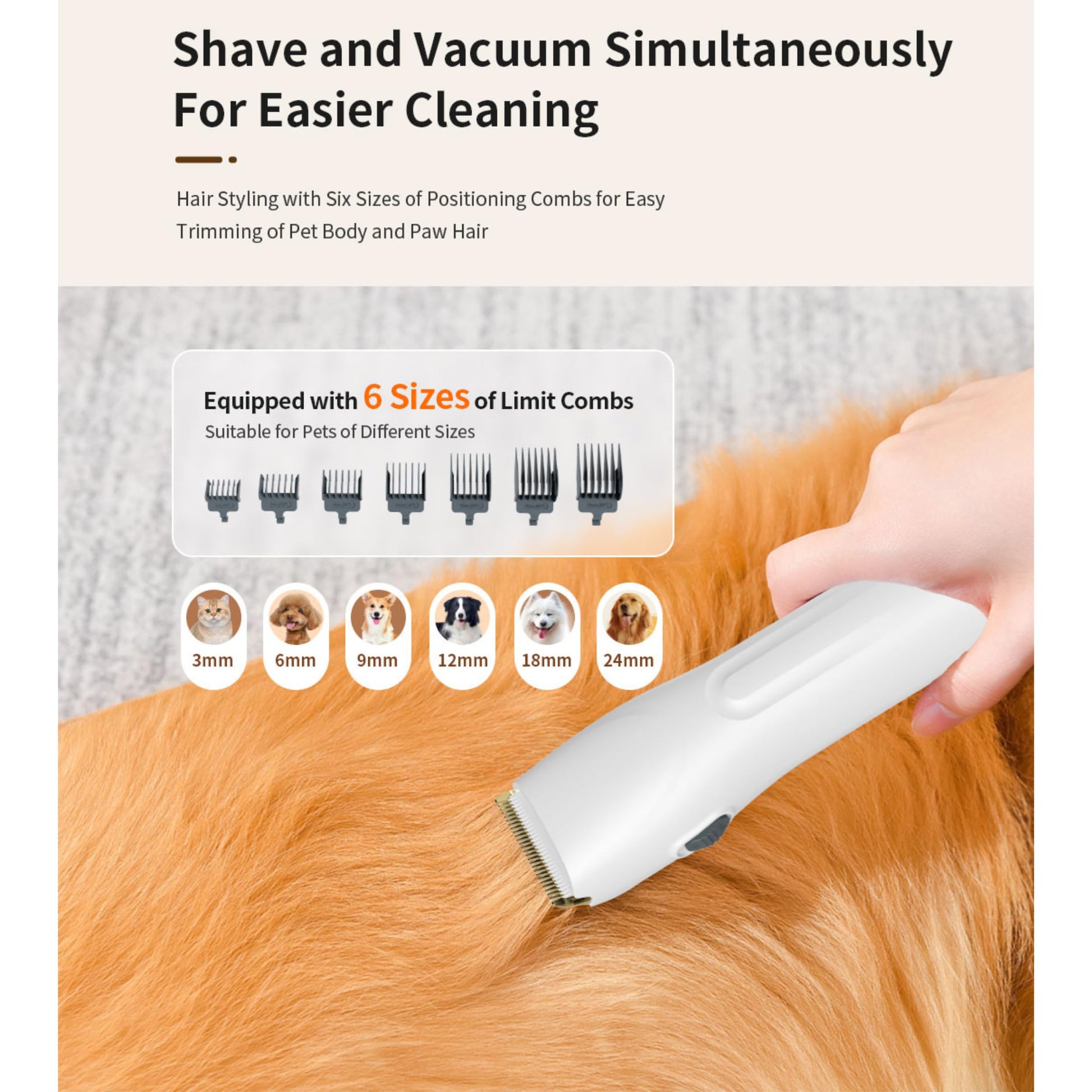 - 6-IN-1 COMPLETE GROOMING SYSTEM: This comprehensive kit is a 6-in-1 system and includes the Vacuum Host, Hose, Grooming Brush, Deshedding Brush, Trimmer, 2-in-1 Flat Brush, Massage brush, Pet hair roller brush, and 6 Clipping Combs.